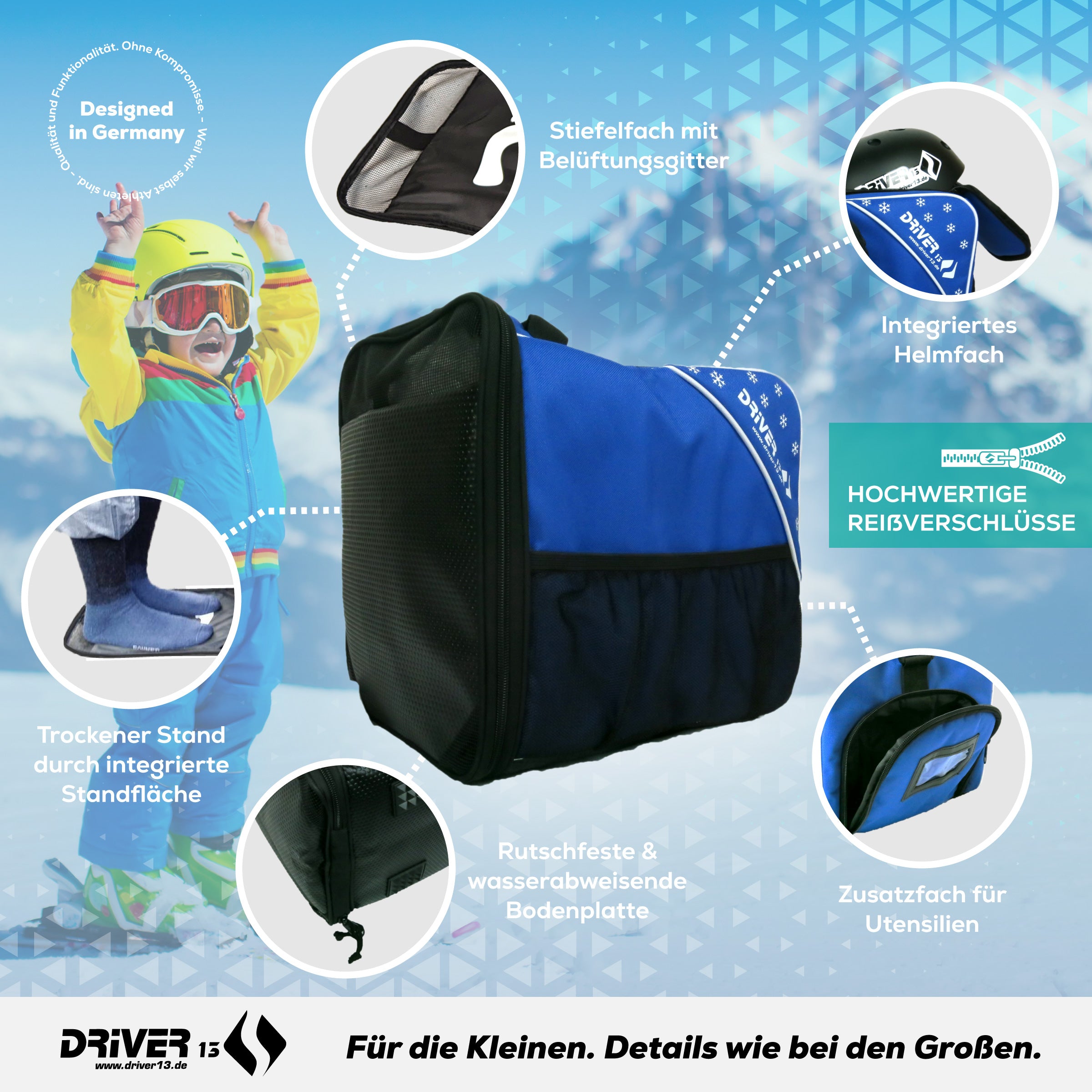Mit der Kids-Edition unserer Kombi-Skistiefeltasche von Driver13 brauchen Ihre Kinder ihre unhandlichen und nassen Schuhe nicht mehr mühevoll umherschleppen, sondern können sie dank integriertem Tragegriff und Schulterriemen Ihr Skizubehör bequem mit sich tragen. Für den Helm ist dabei ein separates, leicht zugängliches Fach in die Tasche integriert. Ebenso bietet die Tasche Platz für weitere Accessoires wie Handschuhe usw.
