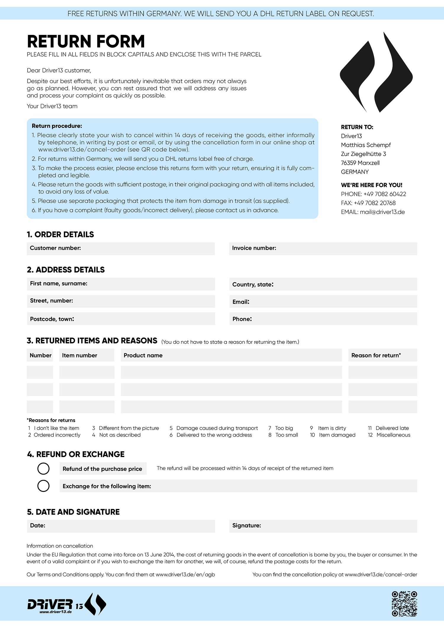 If you have any questions about returns, please feel free to contact us by email at mail@driver13.de.