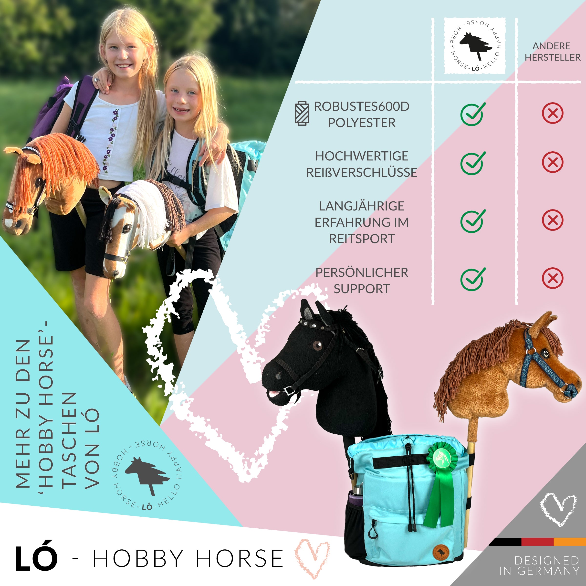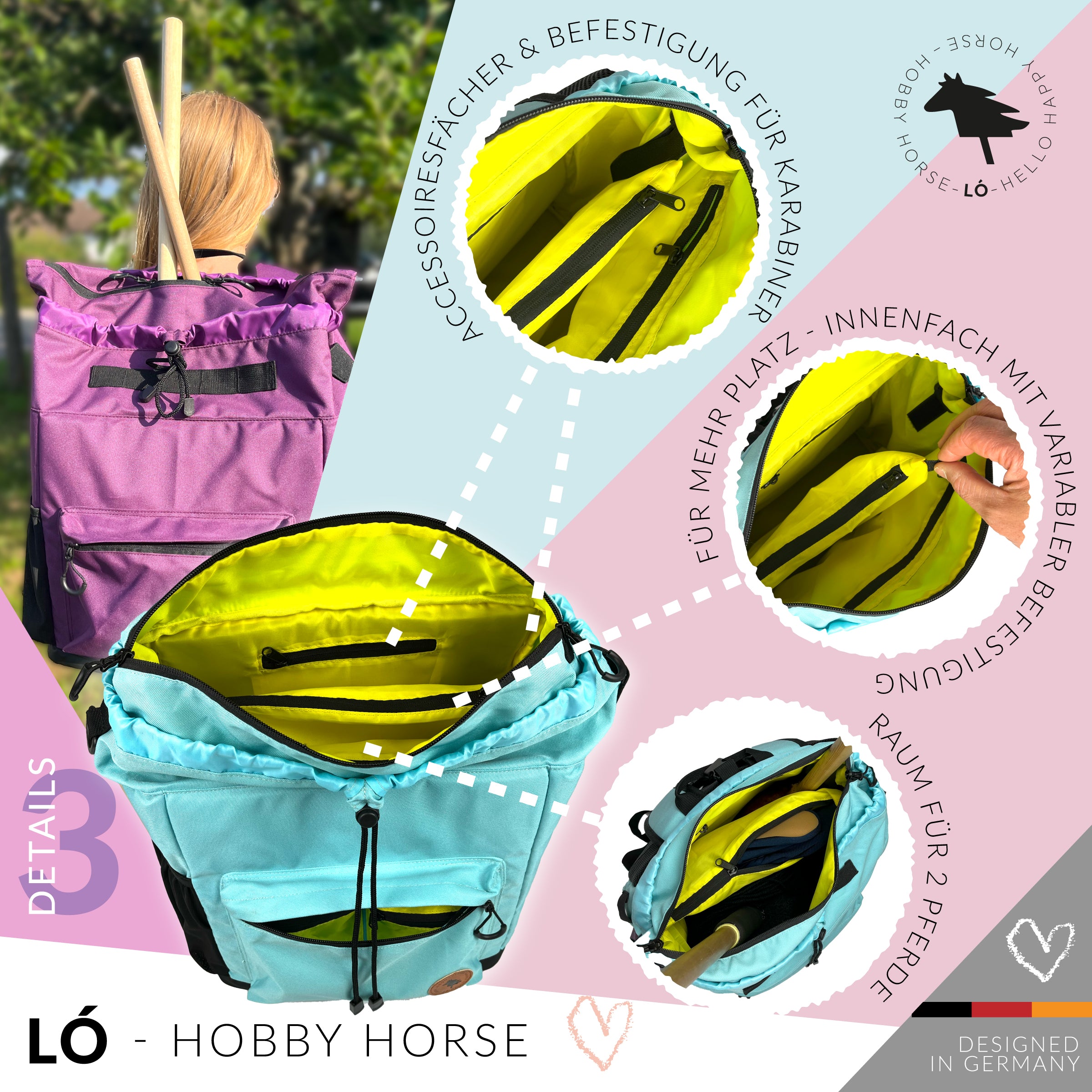 Our new Hobbyhorse backpack "LÓ" is the perfect companion for your hobbyhorsing passion! ❤️ With its spacious interior and a range of practical functions, this backpack meets all your needs. The LÓ HobbyHorse backpack is a lightweight, versatile and practical backpack that has been specially designed for transporting hobby horses. Our backpack can carry up to four hobby horses in total. Two horses can be safely stored inside the backpack, while the other two horses are attached to the loops on the outside of the backpack (right and left). This makes the backpack a practical and safe way to transport up to four hobby horses at the same time. Very clever! The backpack has two small pockets on the front, which are ideal for storing HobbyHorse accessories or other small items. There is an inner pocket inside the backpack that divides the interior of the backpack into two separate areas. This means that both horses can be transported safely and protected. The inner pocket offers enough space for various items that riders can carry. For example, riding clothes can be stored here. In addition, the inner pocket is removable on one side, which allows maximum flexibility in use. Two additional small inside pockets not only make it easier to keep things organized but also increase the functionality of the sports bag. The backpack also has adjustable shoulder straps that ensure comfortable and individual carrying. The straps can be adjusted as needed to optimally adapt the backpack to your body size and shape.