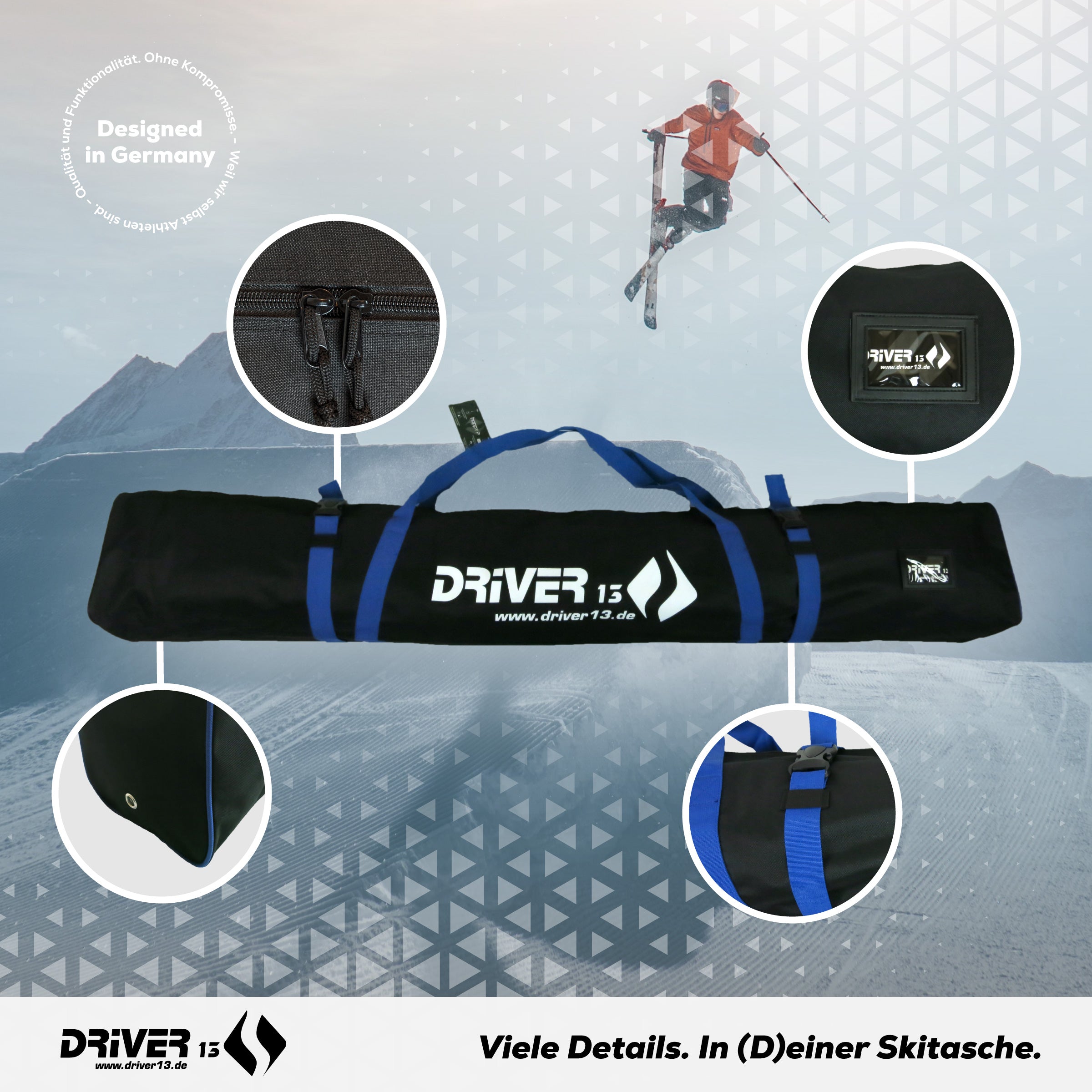 Die Driver13-Skitaschen wurden nach der Maxime entworfen, Einfachheit mit hoher Funktionalität zu verbinden. In ihrem Innern bietet die Skitasche 185 cm ausreichend Platz für ein Paar Ski (inkl. Bindung) und Stöcke. Durch seine wasserabweisende Oberfläche kann der Innenbereich zudem sehr gut gereinigt werden.