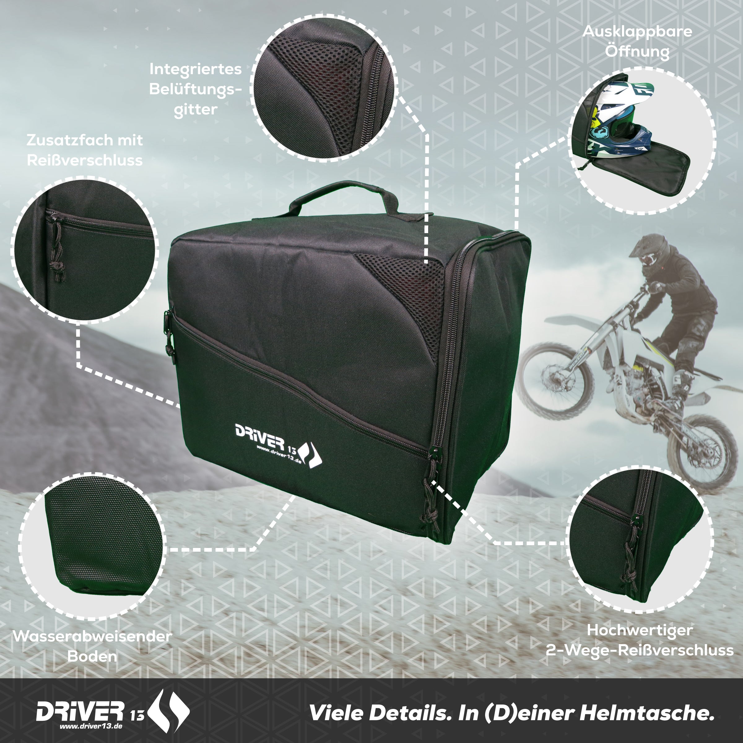 Robuste und PE-Schaum-gepolsterte Helmtasche von Driver13 für ein bequemes und sicheres Mitnehmen Ihres Helmes. Universell für Motorradhelme aller Art - und insbesondere auch für Motocross-Helme - geeignet. Vermeidet unnötige Kratzer auf dem Helm damit Ihr Helm möglichst lange wie neu aussieht. Mit Tragegriff, Belüftungsmesh und Aussenfach.
