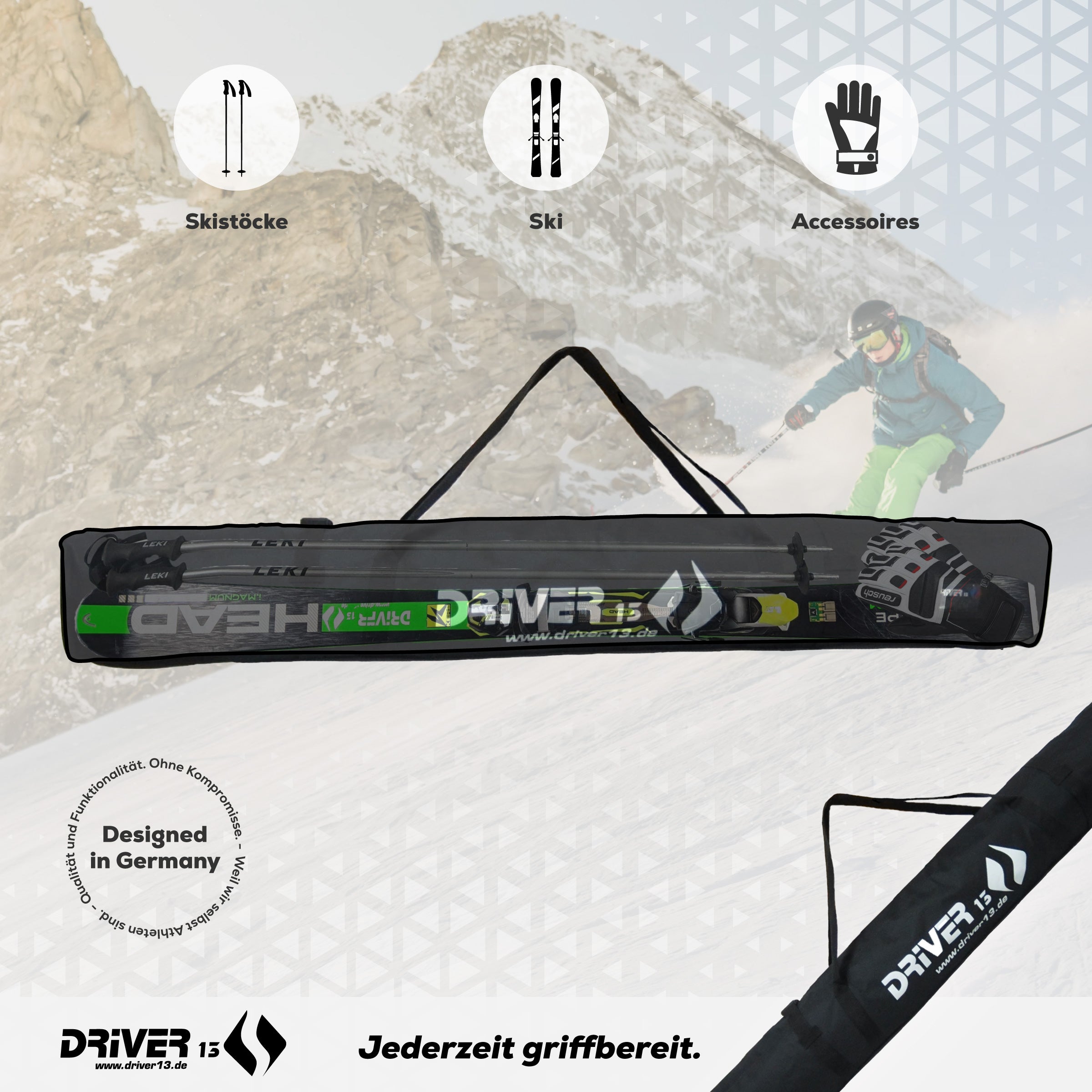Die Driver13-Skitaschen wurden nach der Maxime entworfen, Einfachheit mit hoher Funktionalität zu verbinden. In ihrem Innern bietet die Skitasche 160 cm ausreichend Platz für ein Paar Ski (inkl. Bindung) und Stöcke. Durch seine wasserabweisende Oberfläche kann der Innenbereich zudem sehr gut gereinigt werden.