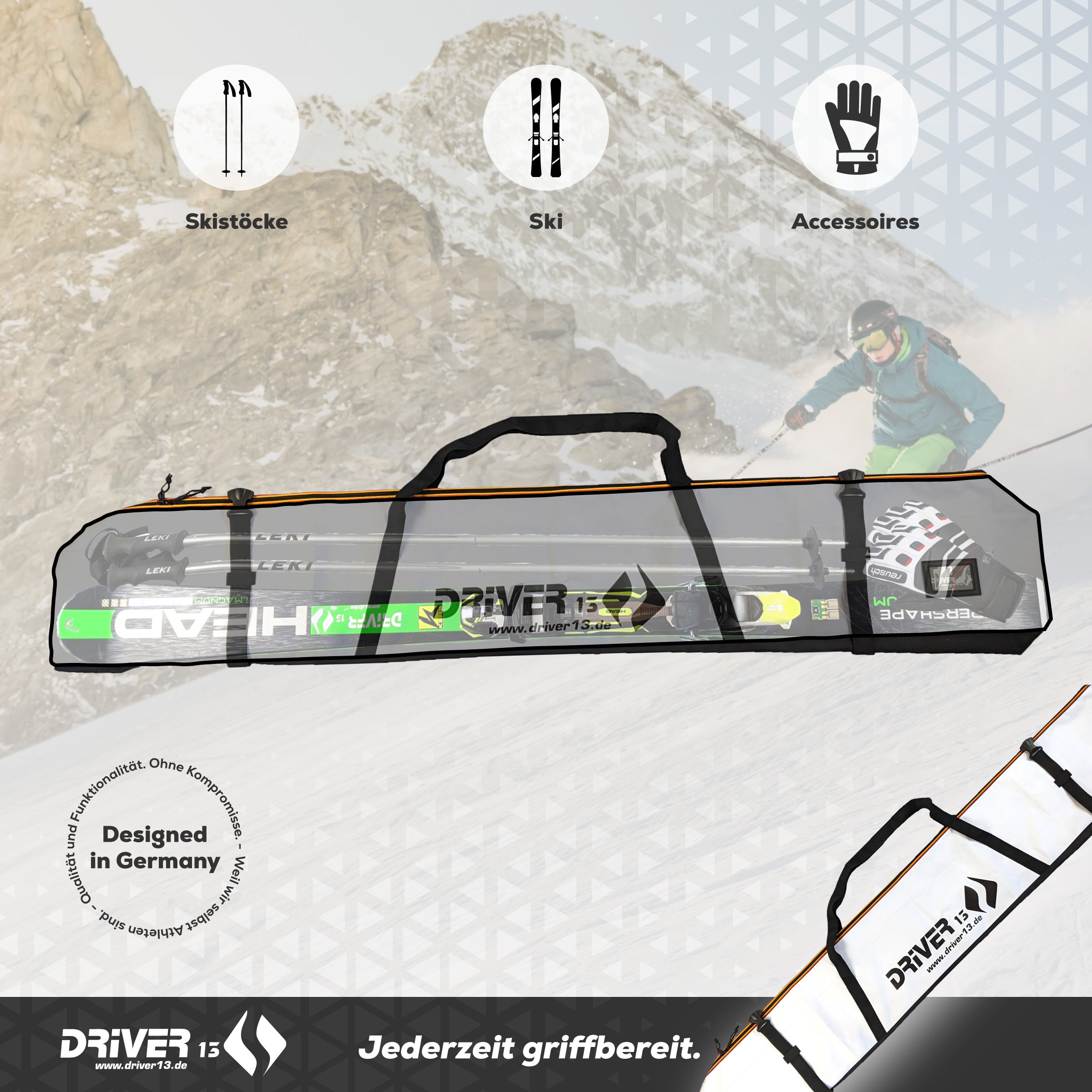 Die Driver13-Skitaschen wurden nach der Maxime entworfen, Einfachheit mit hoher Funktionalität zu verbinden. In ihrem Innern bietet die Skitasche 185 cm ausreichend Platz für ein Paar Ski (inkl. Bindung) und Stöcke. Durch seine wasserabweisende Oberfläche kann der Innenbereich zudem sehr gut gereinigt werden.