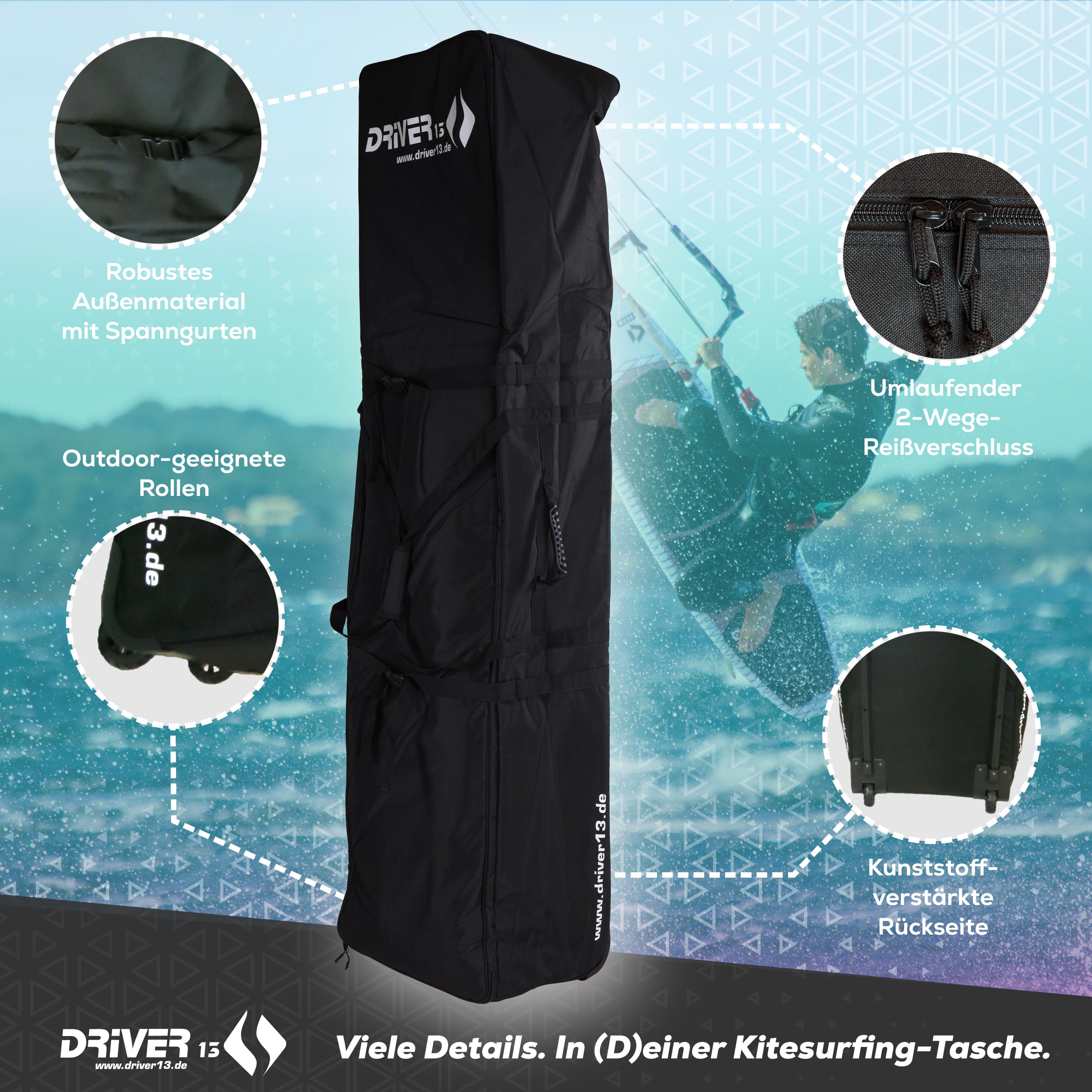 Die Driver13 Traveler Surfboardbag / Reise-Surfboardbag basiert auf einem komplett neuen Surfboard/Reiseboardbag-Konzept, welches die Vorteile verschiedener Bags miteinander vereint. Hergestellt ist die Tasche aus extrastarken und strapazierfähigen Materialien, um die unzähligen Reisekilometer eines Kiters rund um den Globus problemlos wegzustecken.
