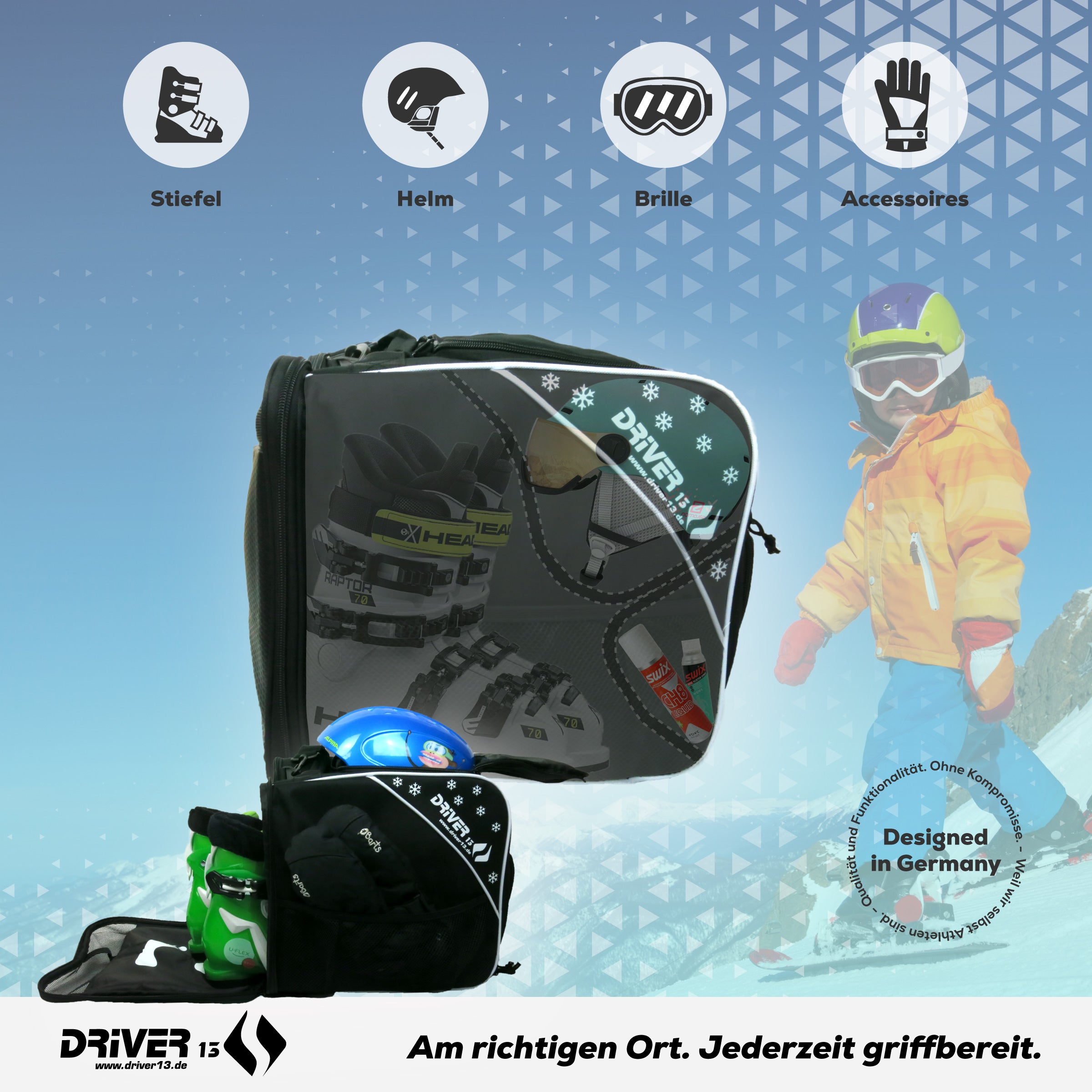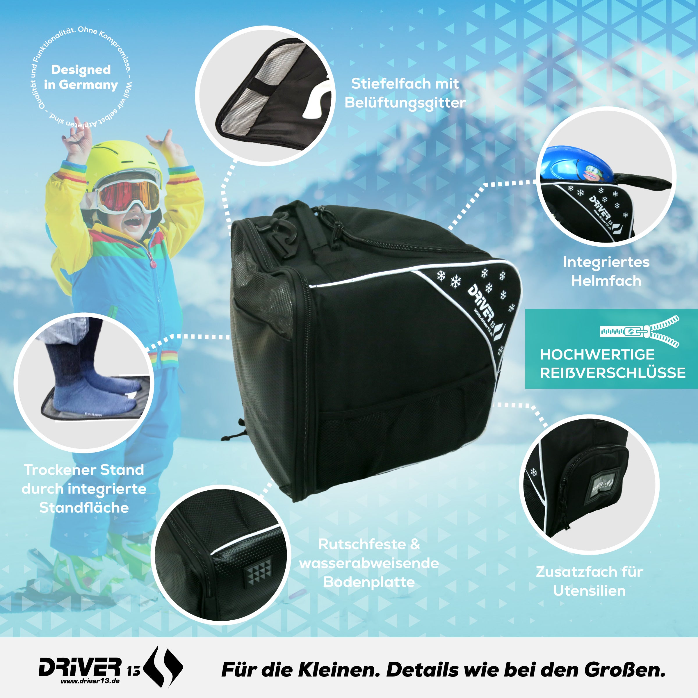 Mit der Kids-Edition unserer Kombi-Skistiefeltasche von Driver13 brauchen Ihre Kinder ihre unhandlichen und nassen Schuhe nicht mehr mühevoll umherschleppen, sondern können sie dank integriertem Tragegriff und Schulterriemen Ihr Skizubehör bequem mit sich tragen. Für den Helm ist dabei ein separates, leicht zugängliches Fach in die Tasche integriert. Ebenso bietet die Tasche Platz für weitere Accessoires wie Handschuhe usw.