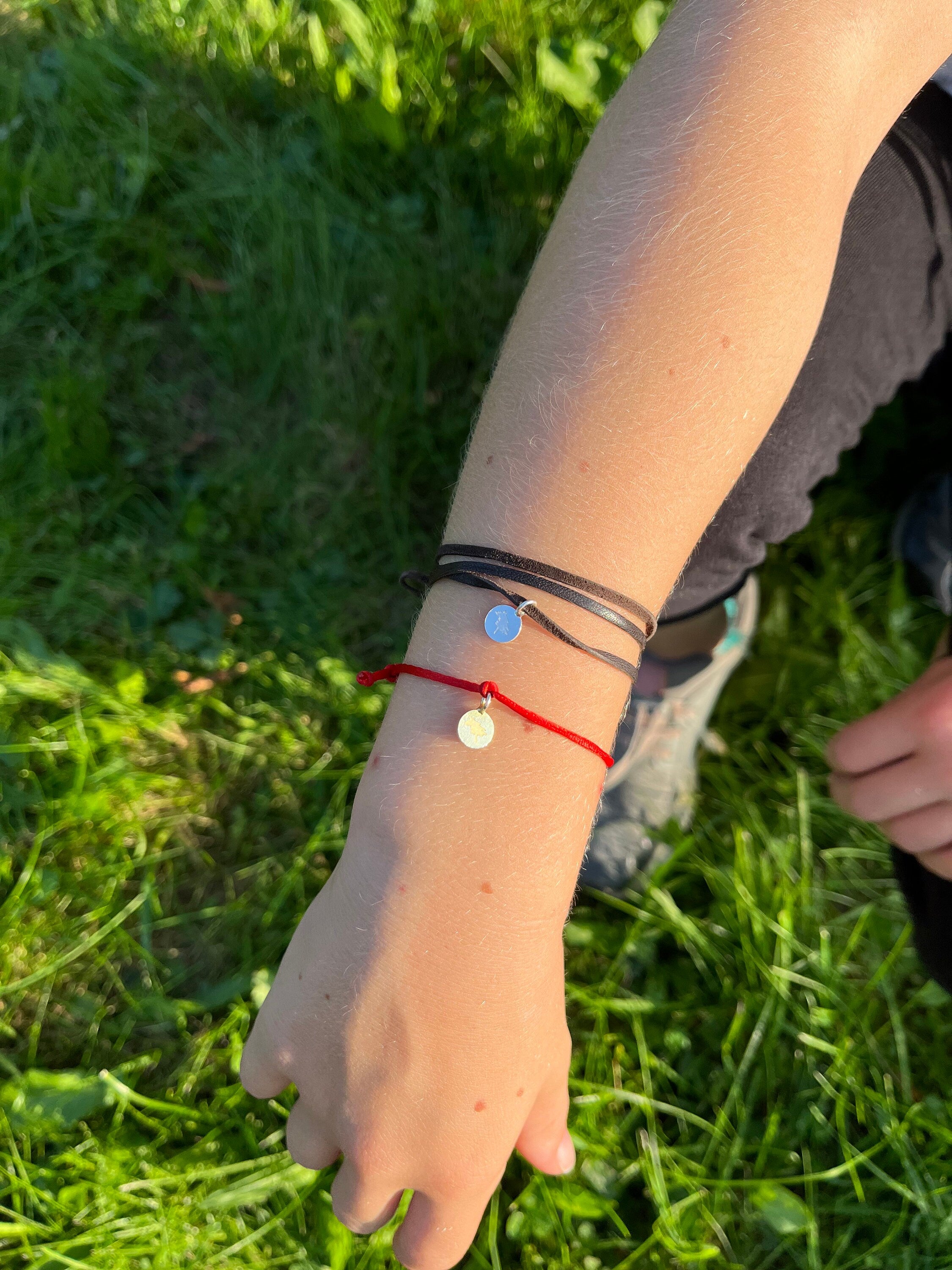 Armband: Satinfaden in individueller Größe; Anhänger: ca. 8 mm Durchmesser und 1 mm Stärke