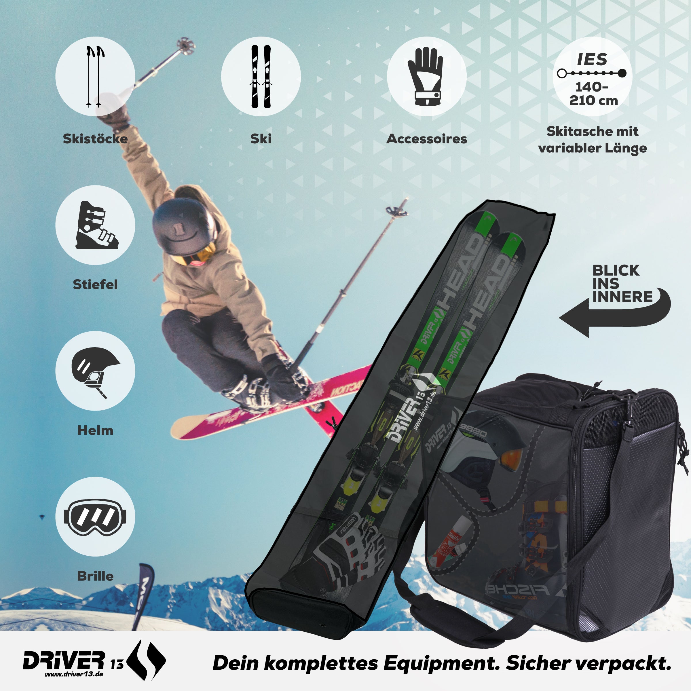 Die Driver13-Skitaschen wurden mit dem klaren Ziel entworfen, die perfekte Symbiose aus Einfachheit und hoher Funktionalität zu schaffen. Diese Skitasche ist nicht nur ein schützender Begleiter für Ihre Ausrüstung, sondern auch ein Statement für anspruchsvolle Skifahrer, die Wert auf Qualität legen.