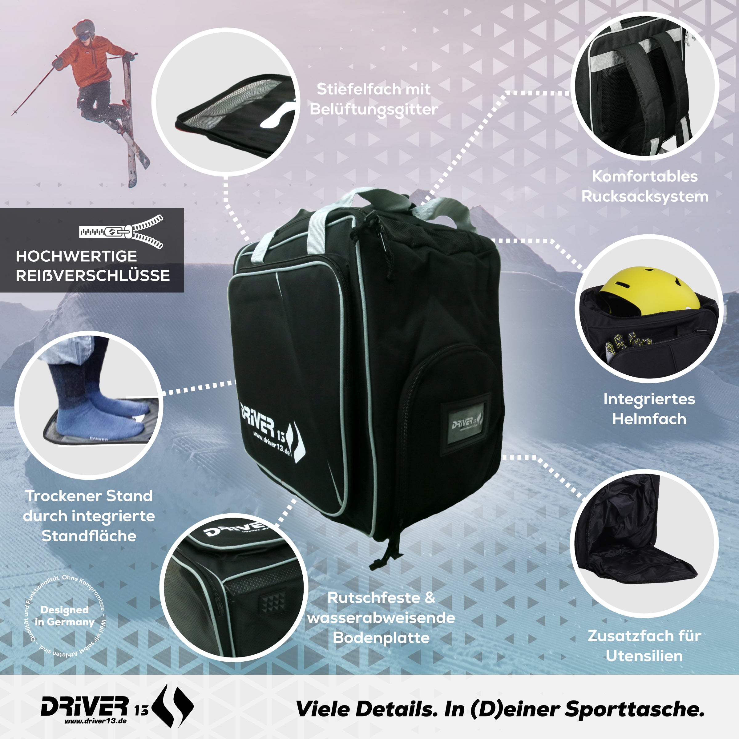 Mit der Skistiefeltasche in der Rucksack-Version von Driver13 brauchen Sie ihre unhandlichen und nassen Schuhe nicht mehr mühevoll umherschleppen, sondern können dank integriertem Rucksacksystem Ihr Skizubehör bequem auf dem Rücken tragen. Für den Helm ist dabei ein separates, leicht zugängliches Fach in die Tasche integriert. Ebenso bietet die Tasche Platz für weitere Accessoires wie Handschuhe usw.
