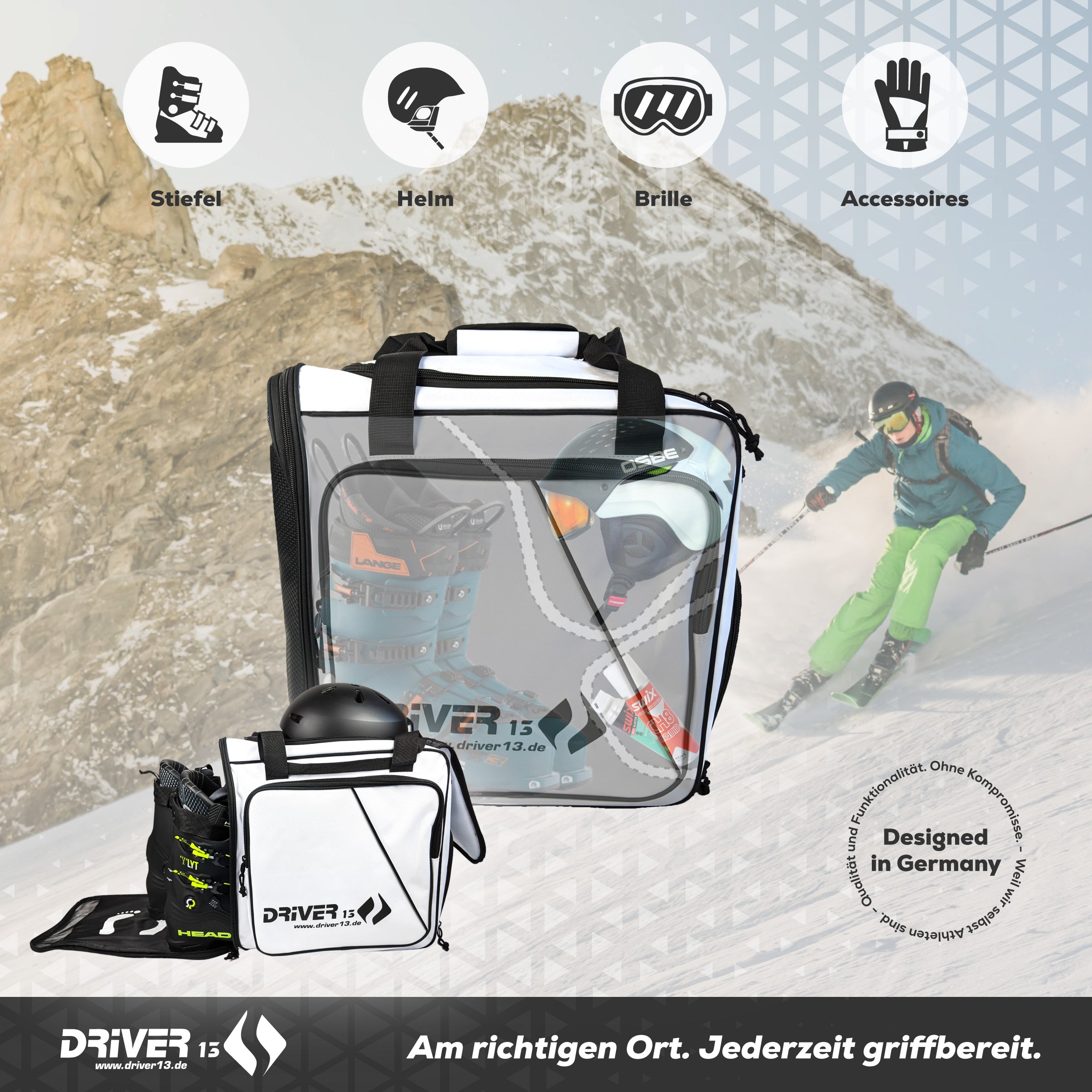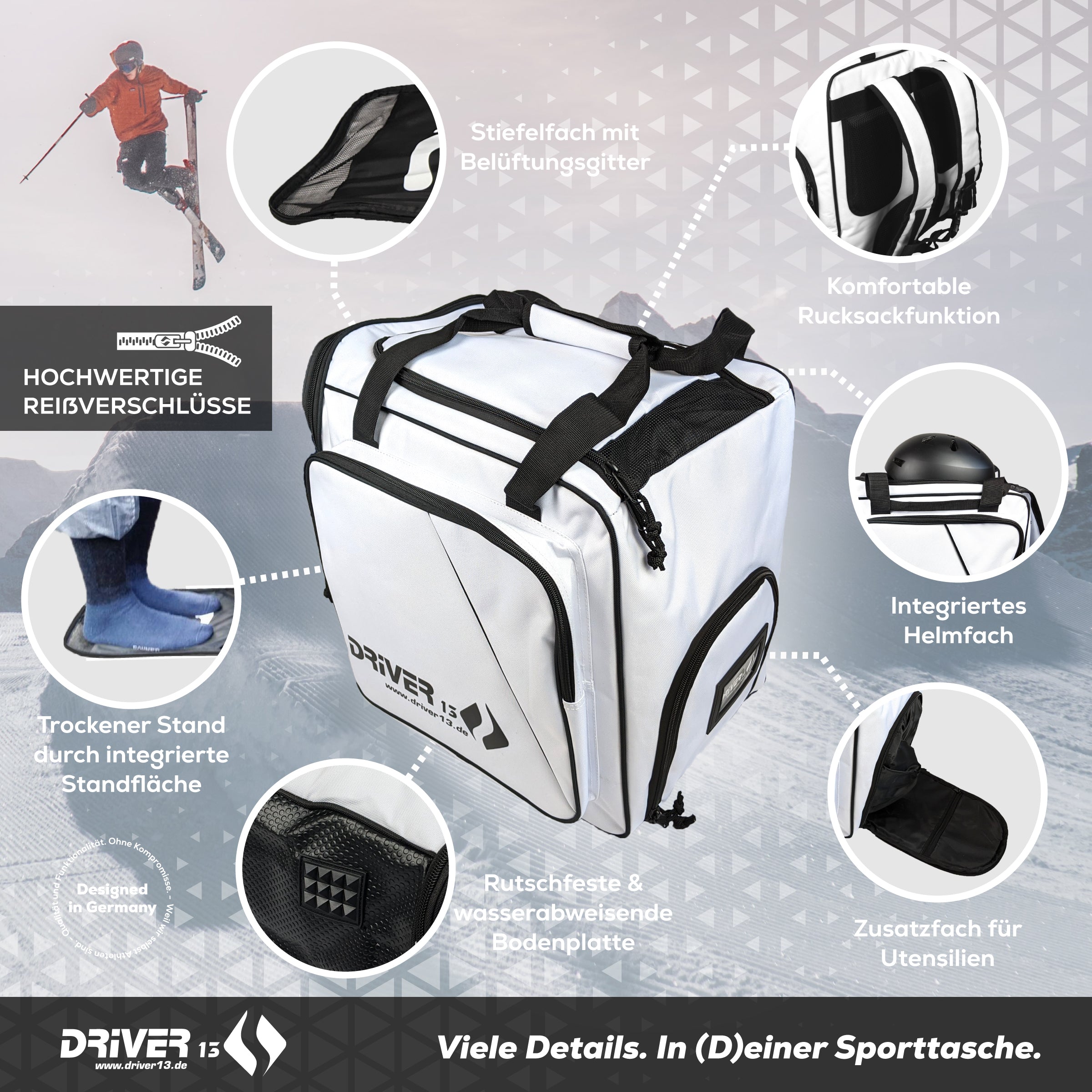 Mit der Skistiefeltasche in der Rucksack-Version von Driver13 ® brauchen Sie ihre unhandlichen und nassen Schuhe nicht mehr mühevoll umherschleppen, sondern können dank integriertem Rucksacksystem Ihr Skizubehör bequem auf dem Rücken tragen. Für den Helm ist dabei ein separates, leicht zugängliches Fach in die Tasche integriert. Ebenso bietet die Tasche Platz für weitere Accessoires wie Handschuhe usw.