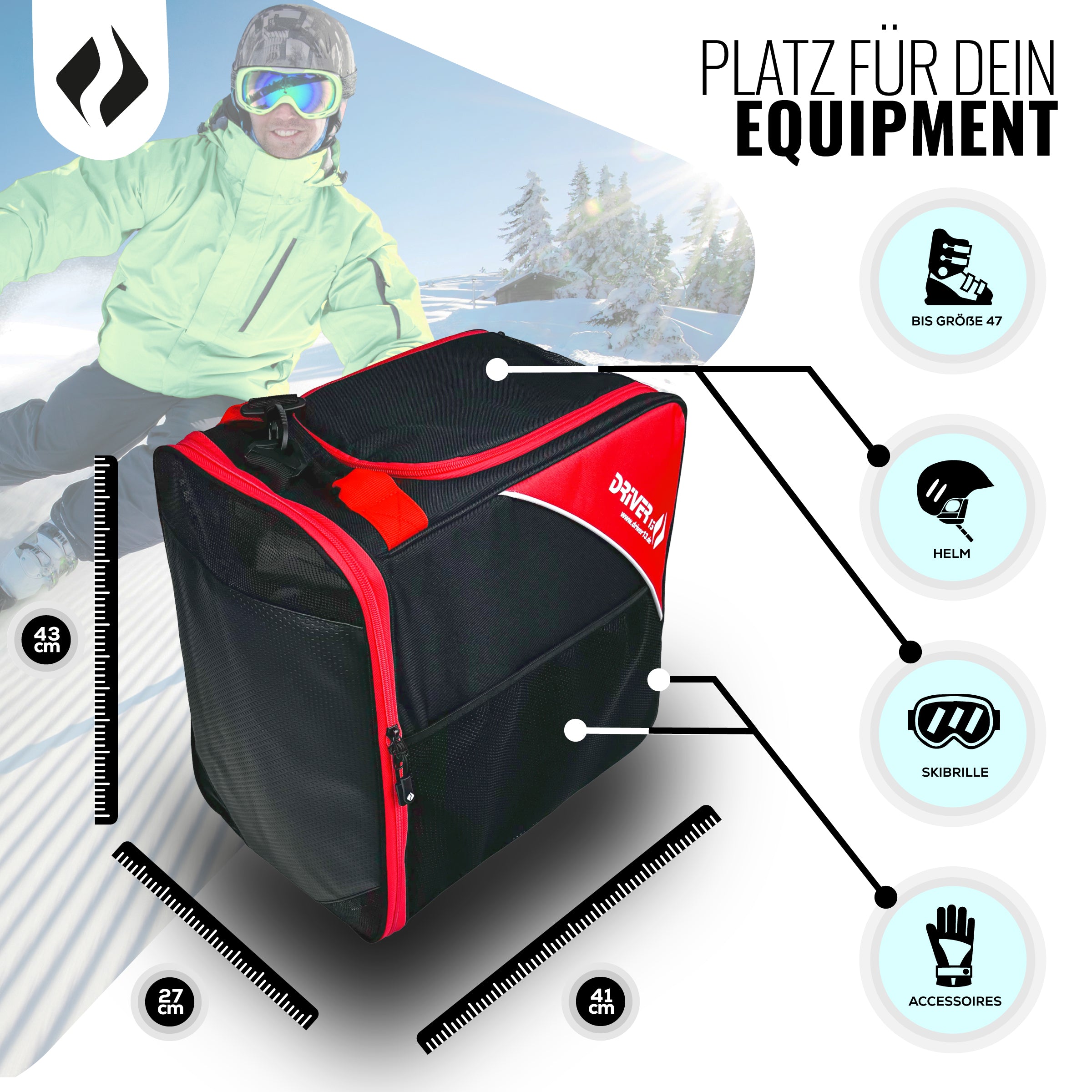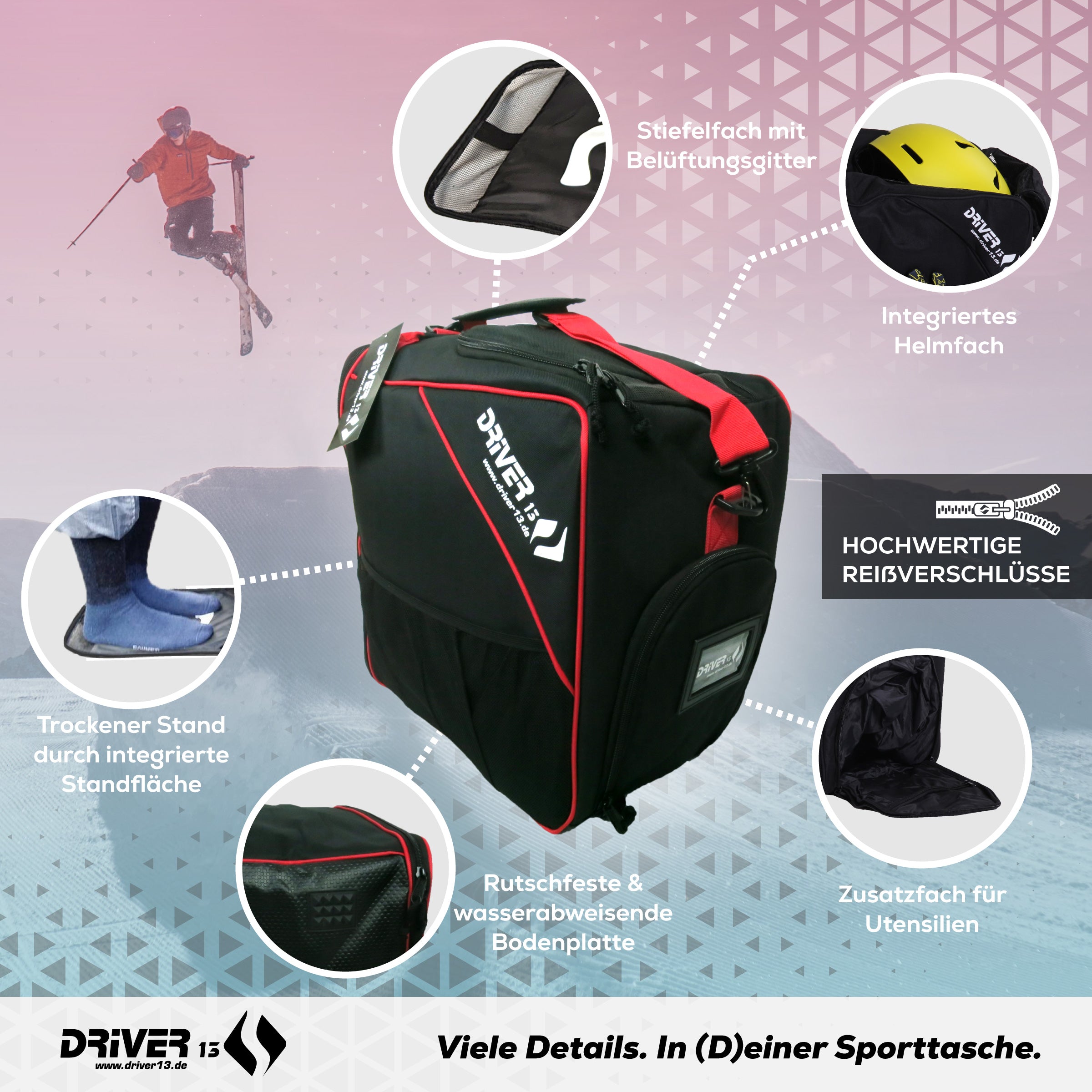 Mit der Kombi-Skistiefeltasche von Driver13 ® brauchen Sie ihre unhandlichen und nassen Schuhe nicht mehr mühevoll umherschleppen, sondern können dank integriertem Tragegriff und Schulterriemen Ihr Skizubehör bequem mit sich tragen. Für den Helm ist dabei ein separates, leicht zugängliches Fach in die Tasche integriert. Ebenso bietet die Tasche Platz für weitere Accessoires wie Handschuhe usw.