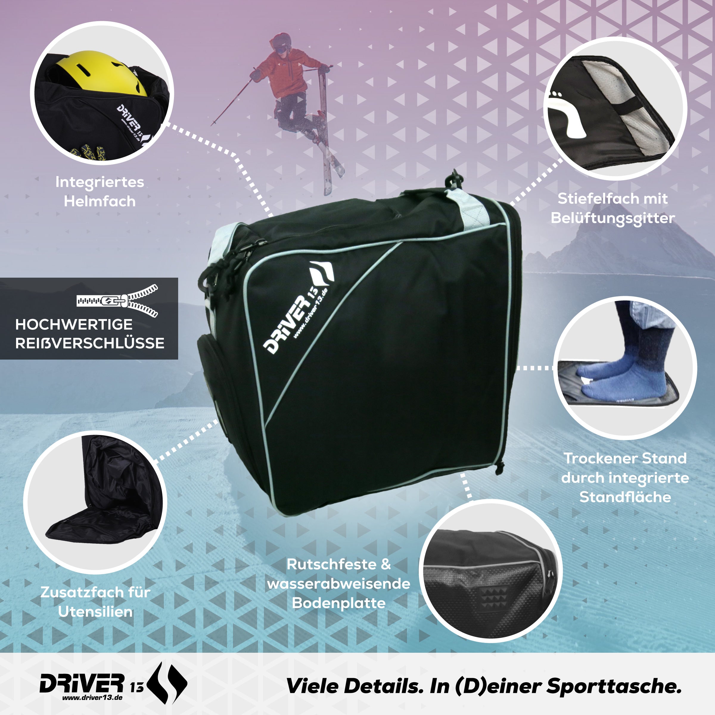 Mit der Kombi-Skistiefeltasche von Driver13 ® brauchen Sie ihre unhandlichen und nassen Schuhe nicht mehr mühevoll umherschleppen, sondern können dank integriertem Tragegriff und Schulterriemen Ihr Skizubehör bequem mit sich tragen. Für den Helm ist dabei ein separates, leicht zugängliches Fach in die Tasche integriert. Ebenso bietet die Tasche Platz für weitere Accessoires wie Handschuhe usw.